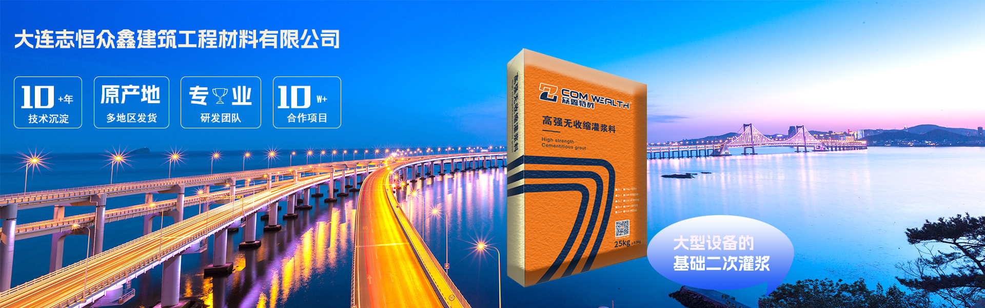 眾鑫特材創建于2011年,旗下擁有大連志恒眾鑫建筑工程材料有限公司、吉林眾鑫新型建筑材料有限公司和陜西眾鑫特材新材料科技有限公司三家分公司,分別坐落于美麗的海濱城市遼寧省大連市、素有北國春城之稱的吉林省長春市和有著悠久的歷史文化的陜西省 榆林市,是一家集研發、生產、銷售、服務為一體的特種砂漿生產企業。 本公司配備專業的實驗室,擁有專業的產品研發團隊并與國內外較先進的砂漿技術同步化,為客戶在不同灌漿領域,加固修補領域、路橋隧道領域、快速修補領域,防水防腐領域、無機地坪材料領域、裝飾裝修領域等,提供了各種優良的產品和多方位的技術支持, 深得廣大專家和客戶的好評與信賴。公司引進國內外先進技術,與瓦克、亞什蘭、阿克蘇諾貝爾、巴斯夫、明凌化工、道康寧、蘇州興邦等諸多國內外公司建立了核心原材料長期供應關系,來保證產品的穩定性。