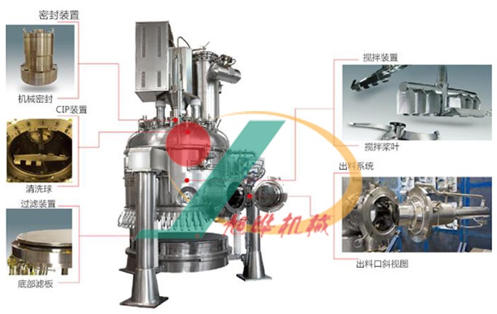 平板式過(guò)濾洗滌干燥三合一 結(jié)構(gòu)與原理 過(guò)濾洗滌干燥機(jī)(業(yè)內(nèi)俗稱“三合一”)能實(shí)現(xiàn)物料的過(guò)濾、洗滌、干燥、滅菌、卸料等連續(xù)工藝過(guò)程,其操作方式屬于分批式操作(間歇操作),廣泛應(yīng)用于制藥、食品、農(nóng)藥、化工等領(lǐng)域。過(guò)濾洗滌干燥機(jī)主要由承壓部分的立式罐體、加熱系統(tǒng)、攪拌系統(tǒng)(攪拌軸、攪拌槳、機(jī)械密封等)、攪拌升降機(jī)構(gòu)、傳動(dòng)機(jī)構(gòu)、過(guò)濾介質(zhì)、出料閥、噴淋裝置、滅菌裝置、液壓泵站、主電控柜(包括變頻器、PLC)等部件組成,實(shí)現(xiàn)了機(jī)、電、儀一體化。 在一批物料的過(guò)濾、洗滌、干燥、固體卸料等基本操作過(guò)程結(jié)束后,過(guò)濾洗滌干燥機(jī)還能用溶劑再將需要進(jìn)一步處理的物料溶解,連續(xù)地進(jìn)行下一步操作過(guò)程。