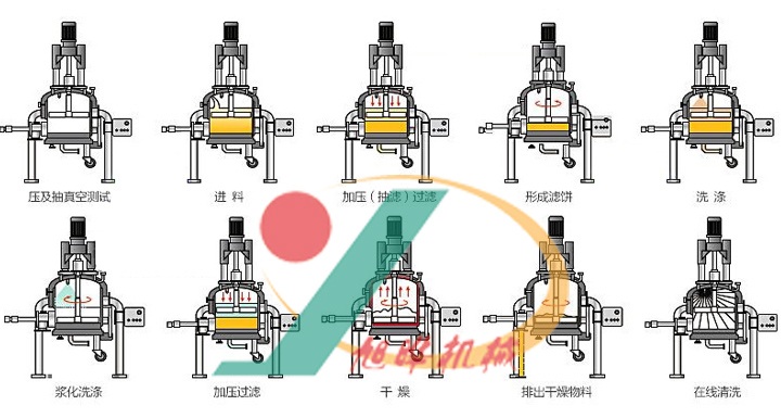 3、多功能一體操作:過(guò)濾、洗滌和干燥在同一設(shè)備中完成。容器壁配備加熱套層,從而能進(jìn)行干燥處理。